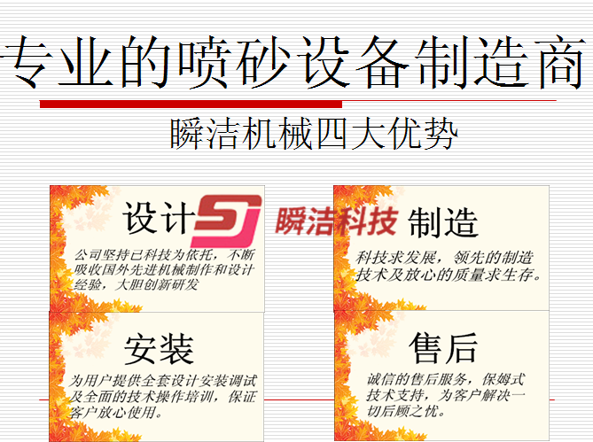 6、  整機(jī)全部采用高耐磨聚氨酯防護(hù),特別是噴砂室,磨料回收管道、旋風(fēng)分離設(shè)備等,局部加厚,保證經(jīng)久耐用。