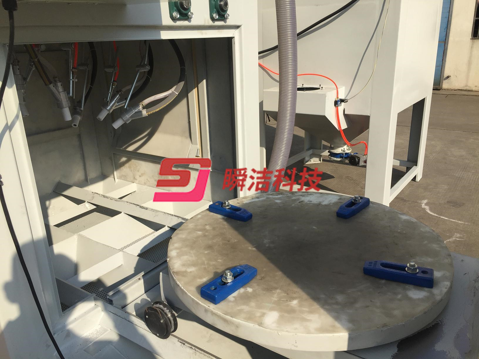 4、  工件在噴砂時(shí),工位臺(tái)360度旋轉(zhuǎn),旋轉(zhuǎn)速度變頻可調(diào),保證每個(gè)工件噴砂均勻。