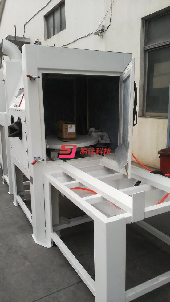、配備活動臺車,和轉盤,操作時將工件放在轉盤上,然后推入機內即可噴砂作業,操作簡單省力。