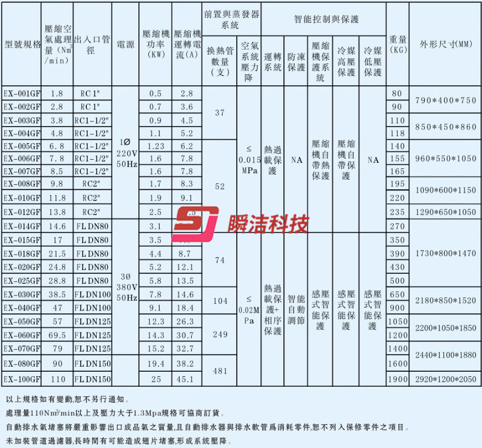 a~1.3MPa (超過1.3MPa可接受訂貨) 壓縮空氣流量:≤干燥機之銘牌標識 操作電源:參照干燥機之銘牌標識 EX風冷高溫型技術(shù)參數(shù)表
